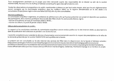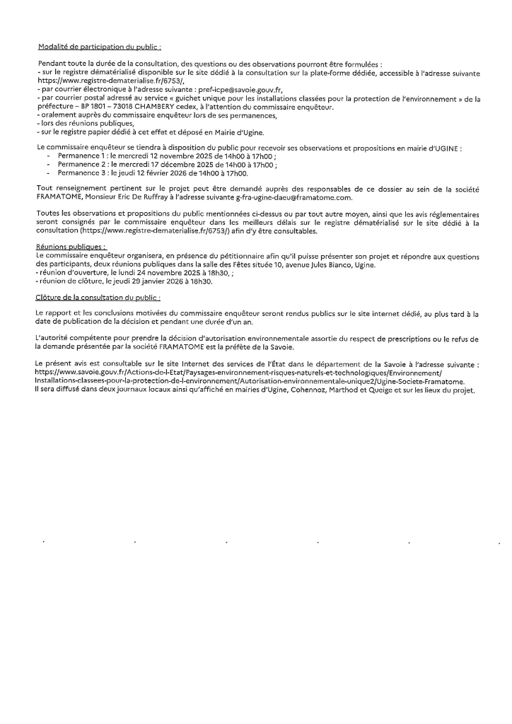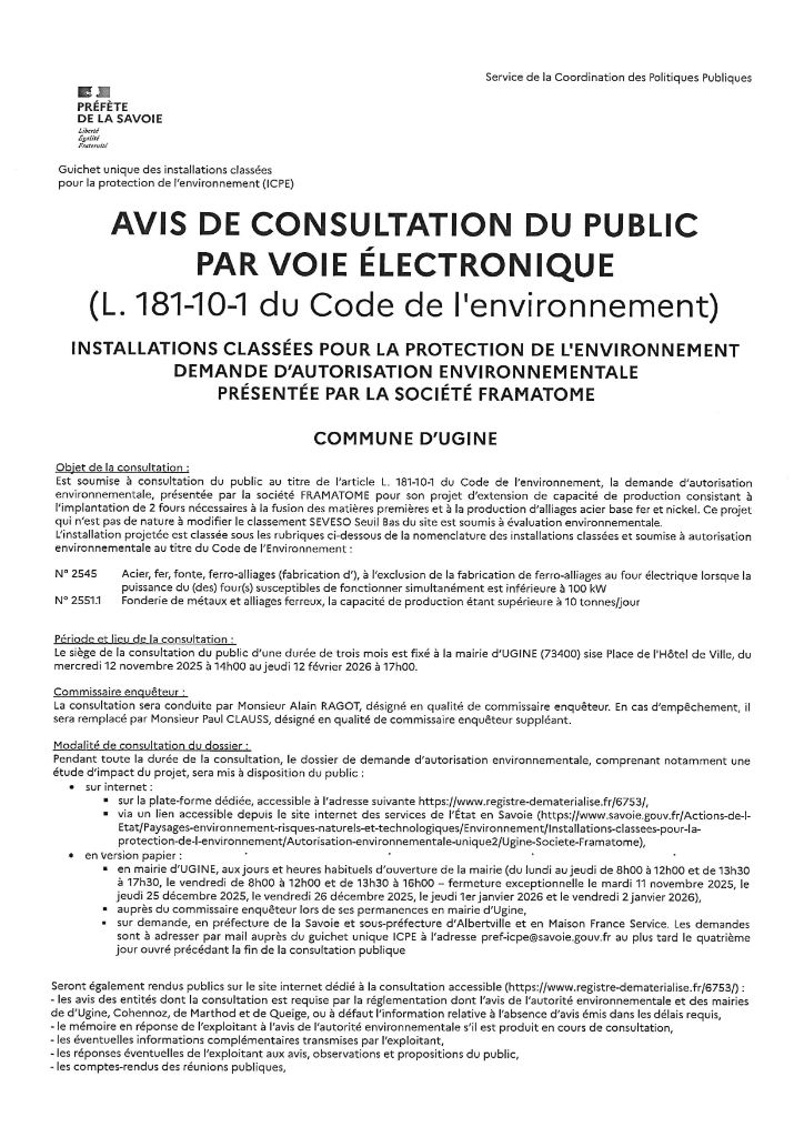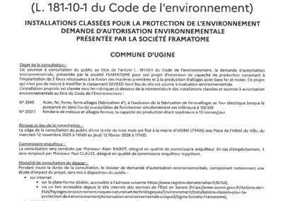 AVIS DE CONSULTATION DU PUBLIC – INSTALLATIONS CLASSÉES POUR LA PROTECTION DE L’ENVIRONNEMENT DEMANDE D’AUTORISATION ENVIRONNEMENTALE PRÉSENTÉE PAR LA SOCIÉTÉ FRAMATOME
