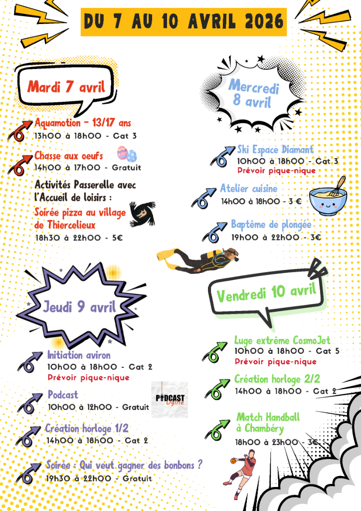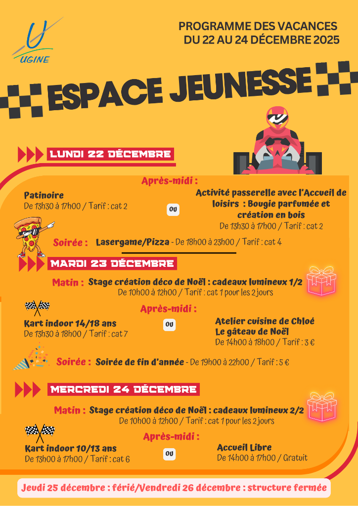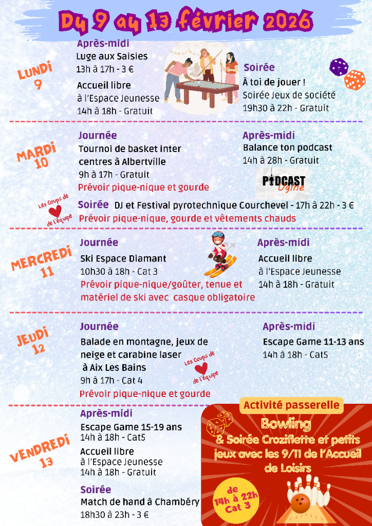 Pendant les vacances scolaires, l’espace jeunesse propose un programme d’activités à la journée ou à la demi-journée, des animations, des stages, des soirées le vendredi soir. Ce programme peut être préparé avec les jeunes selon leurs envies. Une plaquette est mise à disposition avant chaque période de vacances.