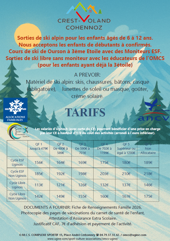 L’OMCS organise des sorties de ski pendant les mercredis de janvier et de février pour les enfants âgés de 6 à 12 ans. Nous acceptons les enfants de débutants à confirmés.
